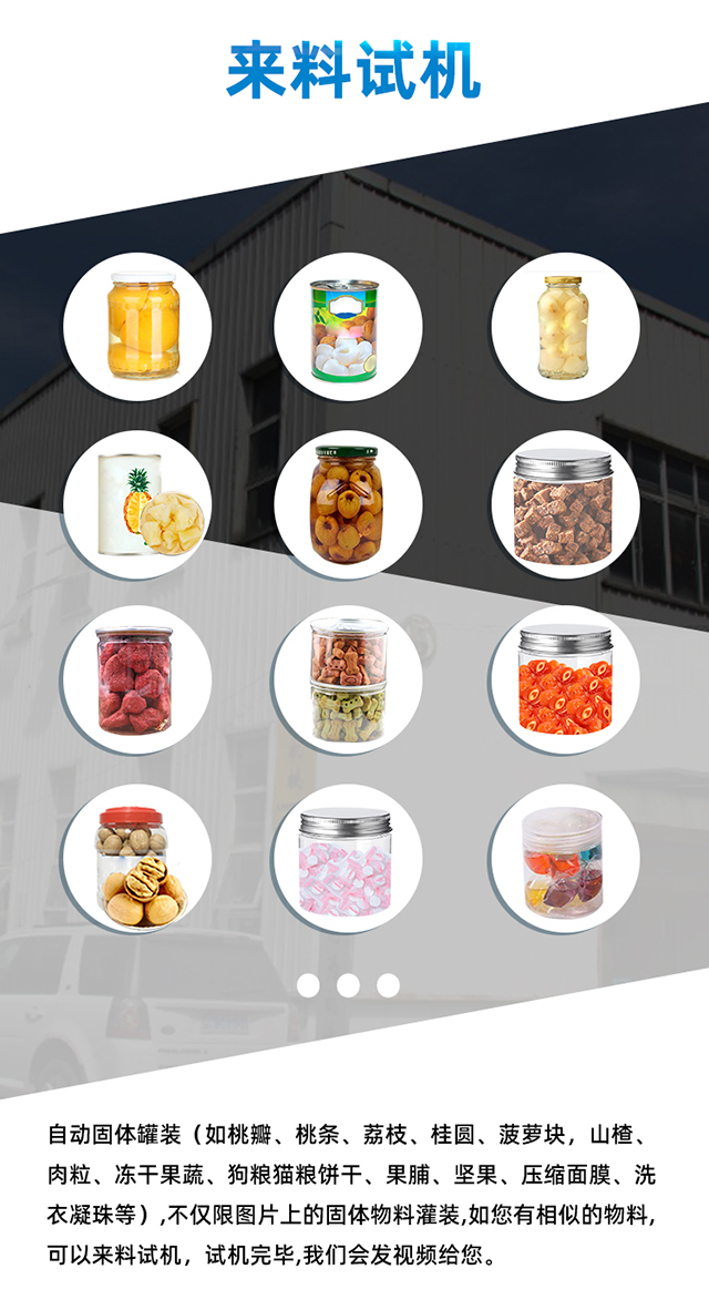 自動固型物裝罐機適用于玻璃罐、馬口鐵罐、塑料罐、廣口瓶等容器。主要應用于黃桃瓣、桃丁、梨球、山楂、草莓、葡萄、杏、荔枝、紅燒肉、雞肉等罐頭產品的自動計量裝罐。